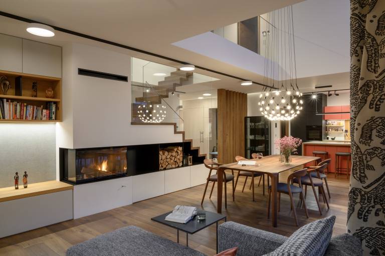 Jasna delitev zaprtih servisnih prostorov, enovitega odprtega bivalnega dela in diskretno ločenega spalnega kraka omogoča smiseln preplet programov, združenih na optimalni bivalni površini.