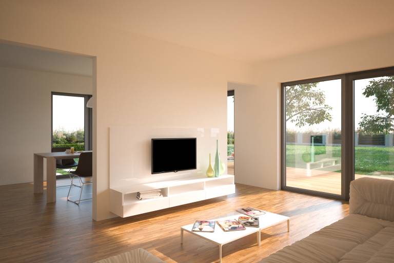 Vzdolžno zasnovana pritlična hiša Gea 120 z daljšo stranico obrnjeno proti jugu optimalno izkorišča moč sonca. Vsi vitalni prostori v hiši, vključno z otroškima sobama, so dobro osončeni od zgodnjega dopoldneva do poznega popoldneva, odvisno od letnega časa.