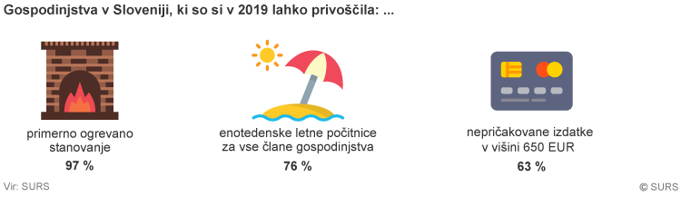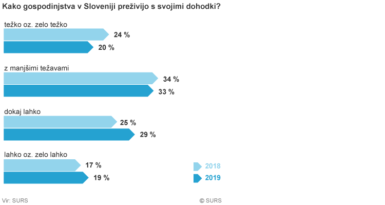 Največ, 33 odstotka gospodinjstev je s svojimi dohodki preživelo mesec z manjšimi težavami, podobno kot v minulih letih. Brez težav je mesec s svojimi dohodki preživelo 19 odstotkov gospodinjstev, kar je dva odstotka več v primerjavi z letom 2018. S 24 na 20 odstotkov pa je upadel delež gospodinjstev, ki so s svojimi dohodki shajala težko oziroma zelo težko.