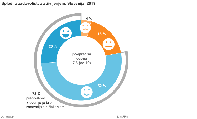 Glede na prejšnje leto se je zvišala še povprečna samoocena zadovoljstva z življenjem. To na lestvici od 0 (povsem nezadovoljen) do 10 (zelo zadovoljen) Slovenci danes ocenjujemo s povprečno oceno 7,5. Predlani je rezultat bil nižji za 0,2 vrednosti ocene.