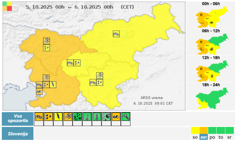 Najmočnejše padavine bodo zajele zahodno in deloma južno Slovenijo. Pričakovati je dolgotrajne nalive, ki lahko povzročijo hitro naraščanje manjših vodotokov ter lokalne poplave.