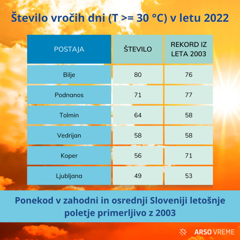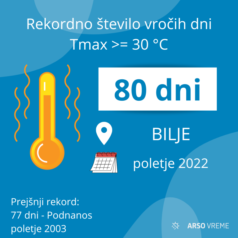 Iz Agencije Republike Slovenije za okolje so sporočili, da je bilo je bilo v Biljah 80 vročih dni, Podnanosu 71, Tolminu 64, Vedrijanu 58, Kopru 56 in Ljubljani 49.