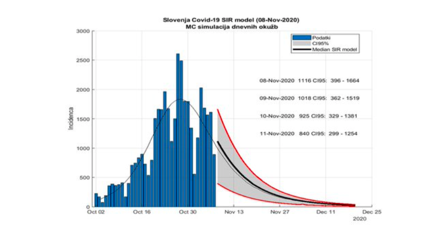Kacin je predstavil graf, ki prikazuje, kaj lahko pričakujemo v naslednjih dneh. Modri stolpci prikazujejo realne podatke, sivi prostor pa prikazuje najvišje in najnižje pričakovane vrednosti. Črna črta prikazuje srednjo vrednost.