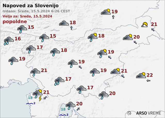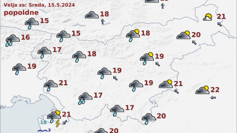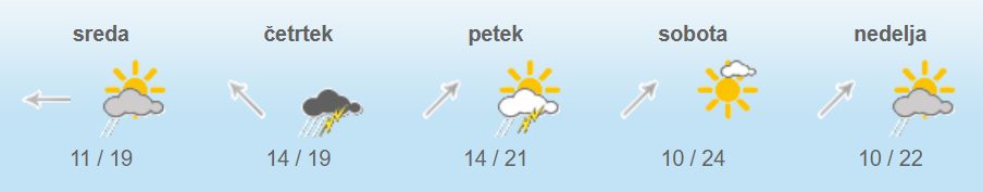 Vreme je namreč spremenljivo do pretežno oblačno s krajevnimi plohami. Po napovedi vremenoslovcev se bodo proti večeru in v noči na četrtek predvsem na zahodu države pojavljale tudi nevihte.