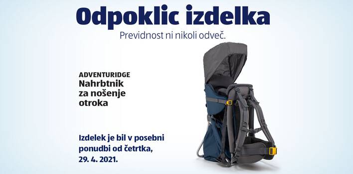 Izdelek nahrbtnik za nošenje otroka, ki ga za Hofer dobavlja podjetje S.A. Sport-Import GmbH, so odpoklicali zaradi nevarnosti, da na nosilni konstrukciji poči zaponka iz umetne mase.