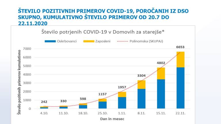 Včeraj je bilo v domovih za starejše občane novo okuženih 176 stanovalcev, tako je aktivno okuženih že 2660 stanovalcev. V zadnjem dnevu se je povečalo tudi število okuženih delavcev v domovih za starejše občane, kjer je bilo samo včeraj odkritih 114 okužb med zaposlenimi, pri čemer je sedaj v domovih za starejše občane trenutno aktivno okuženih 992 zaposlenih.