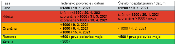 Trenutno smo v oranžni fazi. Za prehode v slabše faze mora biti izpolnjen vsaj en pogoj: tedensko povprečje potrjenih primerov ali število hospitaliziranih, za prehode v boljše faze pa morata biti izpolnjena oba pogoja. Ob enakem trendu razvoja epidemije bi lahko v rumeno fazo prešli v prvi polovici maja.