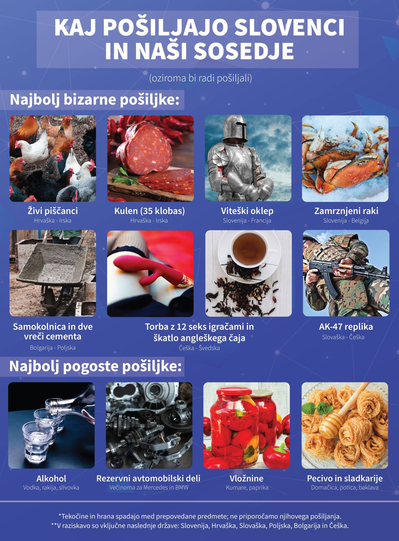 Podjetje Eurosender, spletna platforma za logistične storitve, je pripravilo seznam najbolj »bizarnih in zabavnih« predmetov, ki so jih njihovi uporabniki poskušali poslati v tujino v letu 2018. Velika večina naročil je bila oddanih iz držav blizu Slovenije oziroma neposredno iz Slovenije.