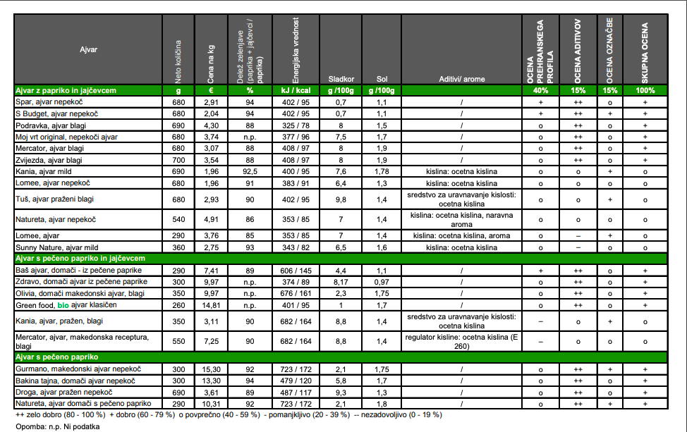»V povprečju imajo izdelki s pečeno papriko (brez jajčevcev ali z njimi) višjo energijsko vrednost, predvsem zaradi večje vsebnosti maščob, saj vsebujejo tudi do 12 gramov maščobe v 100 gramih. Ajvarji iz surovih paprik v 100 gramih vsebujejo le od 2,6 do 8,1 grama maščobe in sorazmerno manj nasičenih maščobnih kislin,« je povzela rezultate Nika Kremić iz Zveze potrošnikov Slovenije in dodala: »Pri nasičenih maščobnih kislinah polovici izdelkov zasveti zelena, ostalim, ki vsebujejo več kot en gram nasičene maščobe pa oranžna luč.«