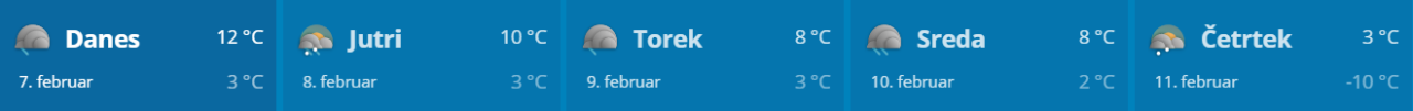 Danes bo večinoma oblačno, nekaj jasnine bo sprva še na vzhodu. Dež se bo čez dan od zahoda razširil na večji del Slovenije, najmanj ga bo v vzhodnih krajih. Pihal bo južni veter, ob morju se bo okrepil jugo. Najvišje dnevne temperature bodo v Gornjesavski dolini okoli 4, drugod od 9 do 15 stopinj Celzija.
