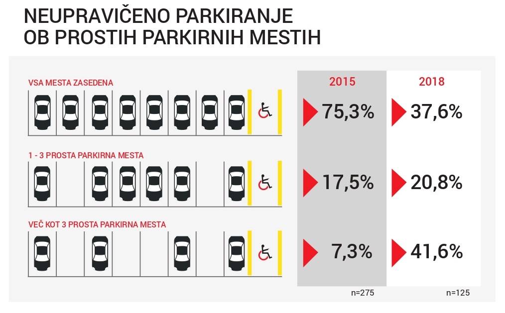 Medtem ko so kršitelji leta 2015 na invalidska mesta najpogosteje oziroma v 75 odstotkih parkirali takrat, ko v bližini ni bilo parkirnih mest za vse, se je to leta 2018 spremenilo. Kar 41,6 odstotka tistih, ki so parkirali neupravičeno, je namreč to storila v času, ko so bila v bližini prosta več kot tri običajna parkirna mesta.