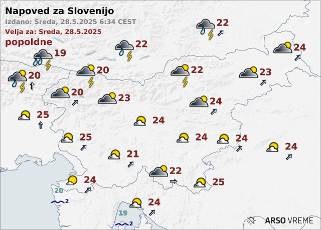 Proti večeru se bo od severa začelo oblačiti, nastajati bodo začele plohe in nevihte. Najvišje dnevne temperature bodo od 20 do 25 stopinj Celzija.