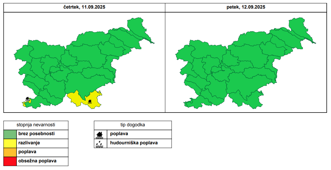 Ob krajevnih plohah in nevihtah lahko danes prehodno narastejo hudourniški vodotoki in manjše reke v več delih Slovenije.
