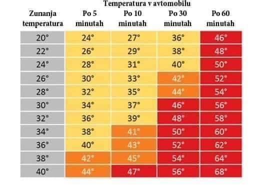 Tudi pri temperaturah okoli 21 stopinj in manj se lahko avto v sončnih dneh v manj kot desetih minutah ogreje toliko, da toplota ogroža življenje.