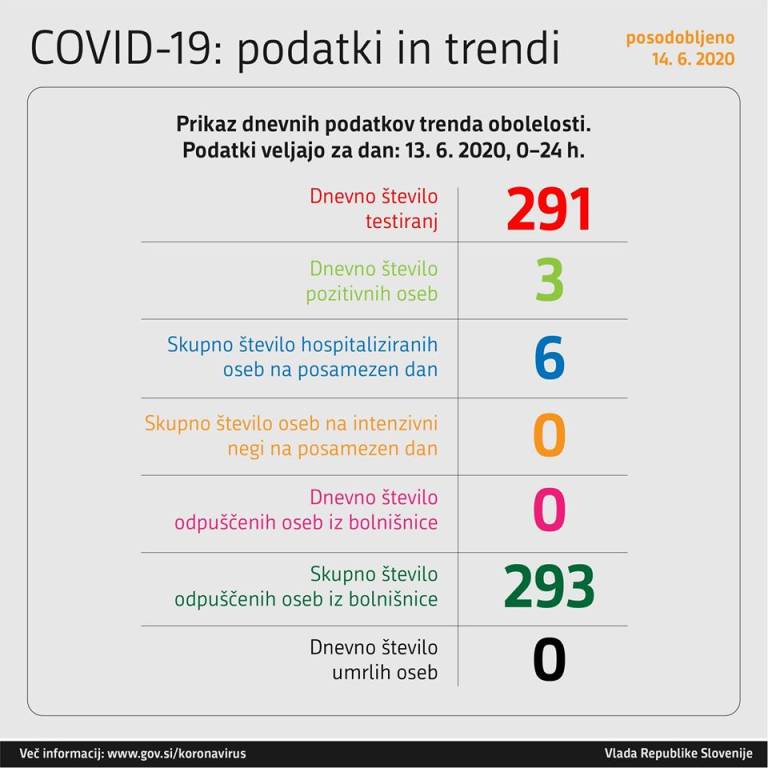 V Sloveniji so v soboto po vladnih podatkih ob 291 testiranjih potrdili 3 nove okužbe s koronavirusom, umrla pa ni nobena oseba s covidom-19.
