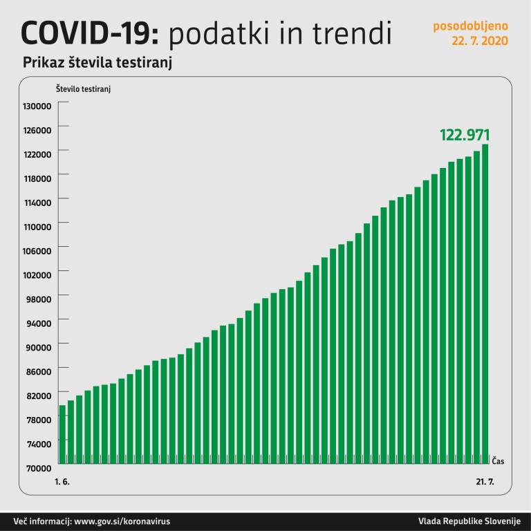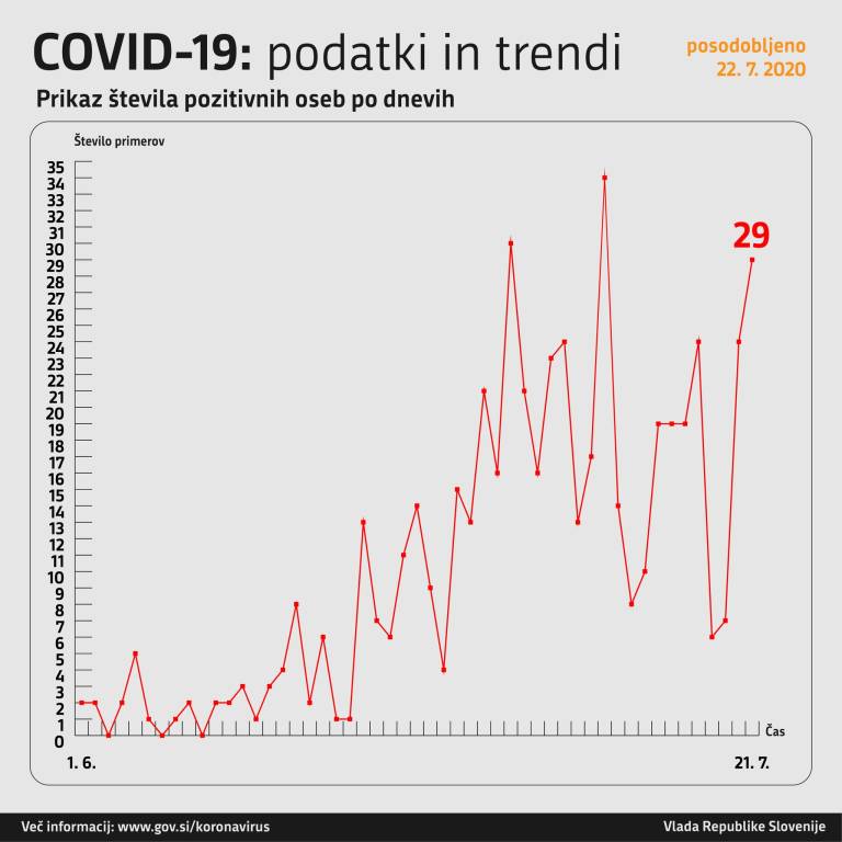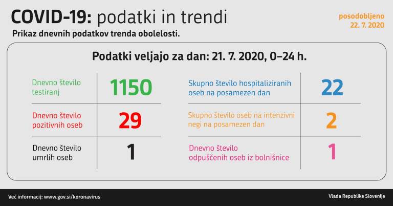 Včeraj, 21. julija, so v Sloveniji opravili 1.150 testiranj na novi koronavirus. Potrdili so 29 novih okužb. Za primerjavo: dan pred tem je število novih okužb znašalo 24.
