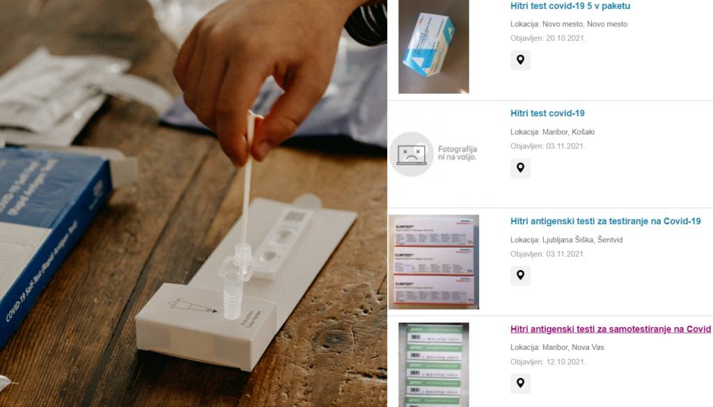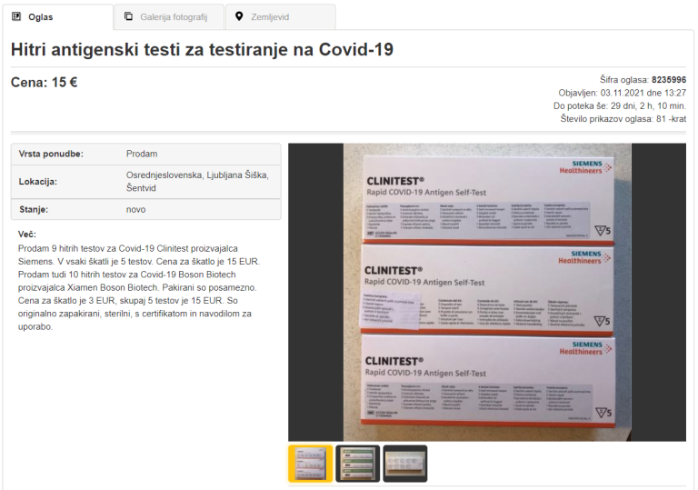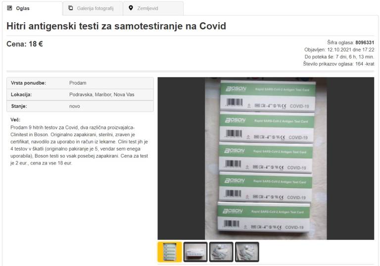 Na strani spletnega oglasnika Bolha.com lahko najdemo več oglasov, v katerih uporabniki prodajajo hitre antigenske teste za testiranje na covid-19.