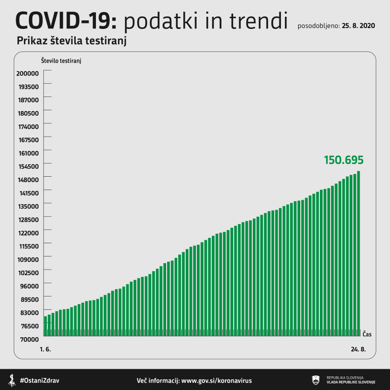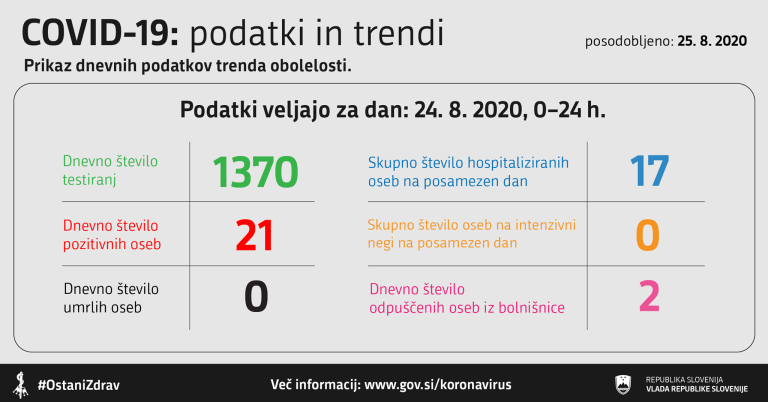 V Sloveniji so včeraj, 24. avgusta, opravili 1370 testiranj na novi koronavirus. Potrdili so 21 novih okužb. Za primerjavo. Dan prej so potrdili 14 novih okužb ob 543 opravljenih testiranjih.