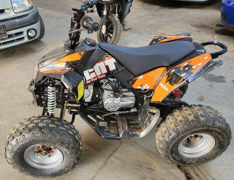 Kupite pa lahko tudi štirikolesnik znamke Hechht, letnik 2021. Ta črni in oranžen štirikolesnik je dobro ohranjen, vozen, možno je, da je akumulator izpraznjen, saj je vozilo stalo.