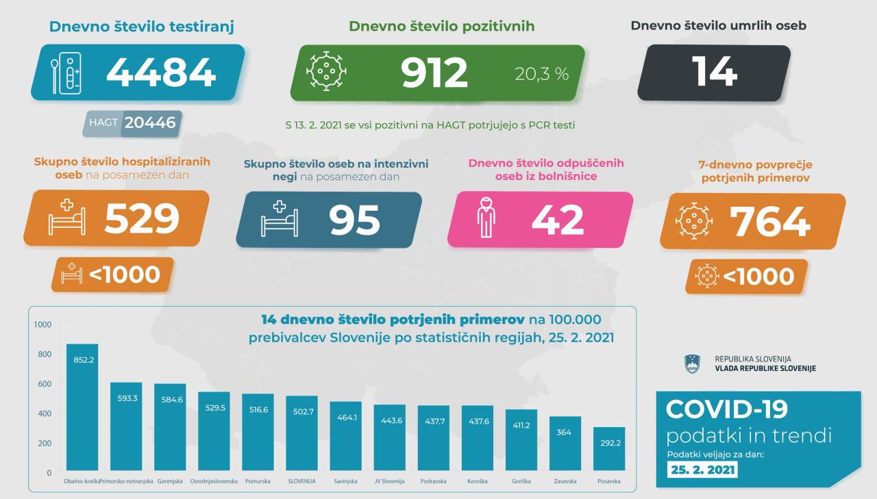 V Sloveniji so včeraj, 25. februarja, opravili 4484 PCR testiranj na koronavirus in potrdili 912 novih okužb, gre za 20,3 odstotni delež okužb.