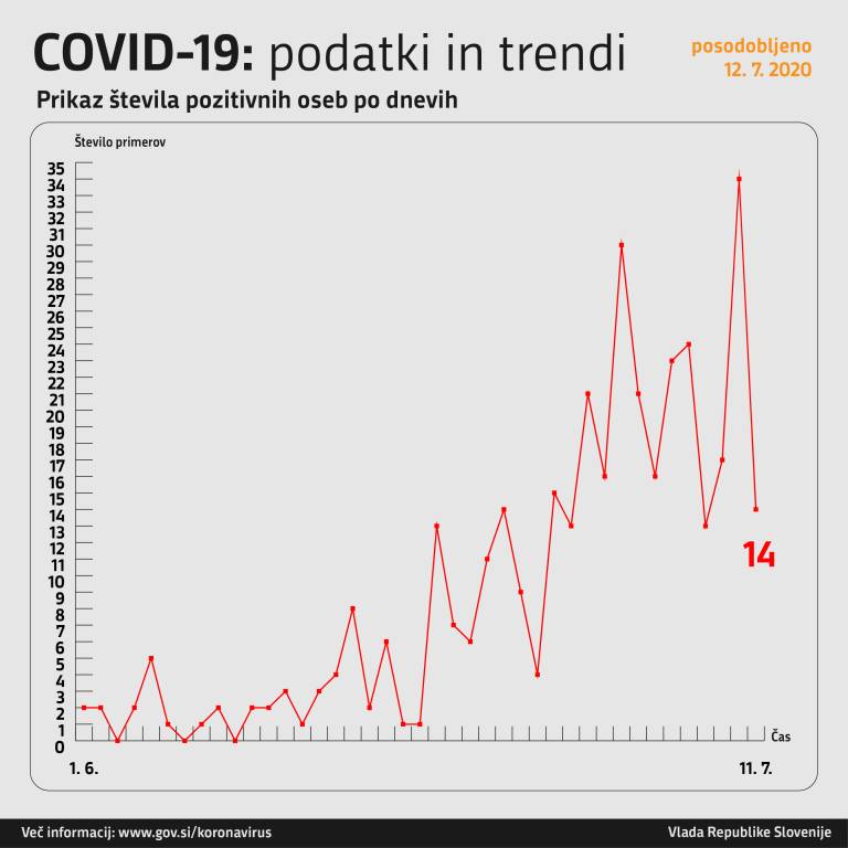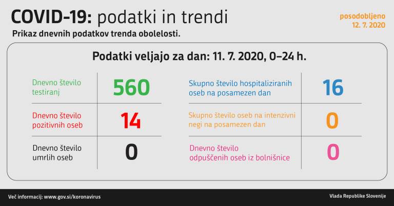Včeraj, 11. julija, so v Sloveniji opravili 560 testiranj na novi koronavirus, pri čemer so odkrili 14 novih okužb.