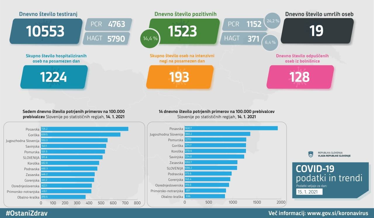 V Sloveniji so včeraj, 15. januarja, opravili 10.553 testiranj na koronavirus in potrdili 1523 novih okužb, gre za 14,4-odstotni delež.