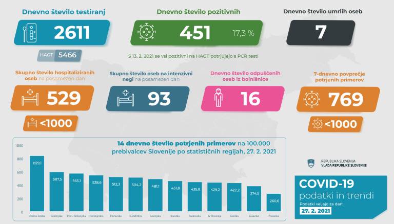 V Sloveniji so včeraj, 27. februarja, opravili 2611 PCR testiranj na koronavirus in potrdili 451 novih okužb, gre za 17,3 odstotni delež okužb.