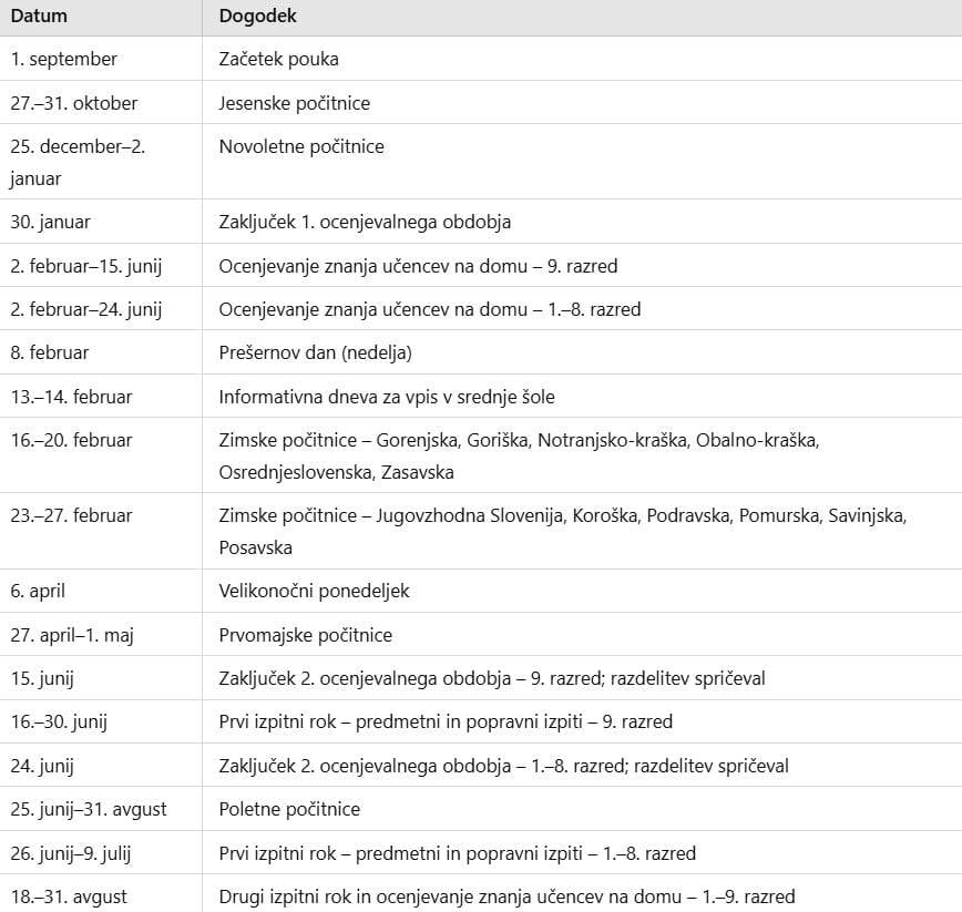 Skupno bo šolsko leto 2025/26 ponudilo šest počitniških terminov.