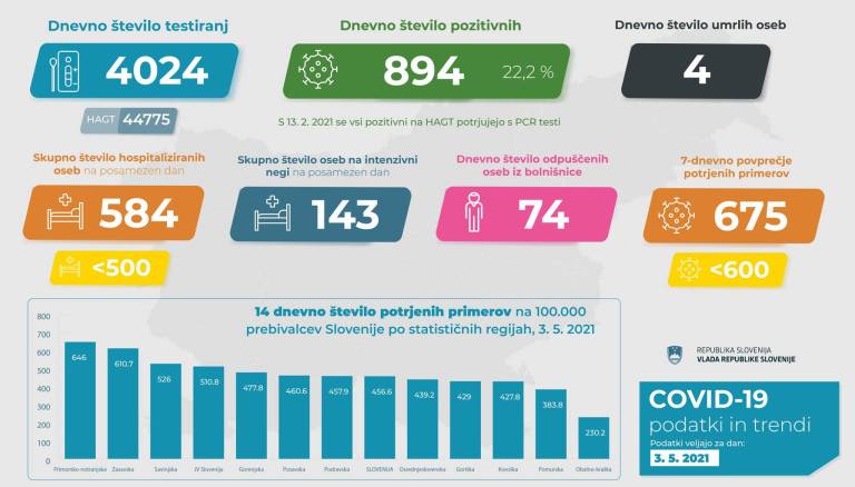 V Sloveniji so včeraj, 3. maja, opravili 4024 PCR testiranj na koronavirus in potrdili 894 novih okužb, gre za 22,2-odstotni delež okužb. Aktivnih primerov je po podatkih Covid-19 Sledilnika trenutno 9675.