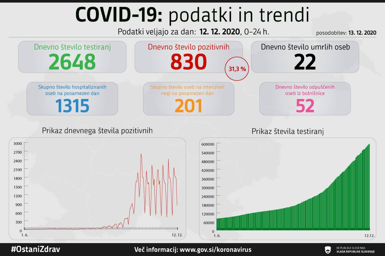 V Sloveniji so v včeraj, 12. decembra, opravili 2648 testiranj na koronavirus in potrdili 830 novih okužb. To pomeni, da je bil delež pozitivnih testov tokrat 31,3 odstoten.