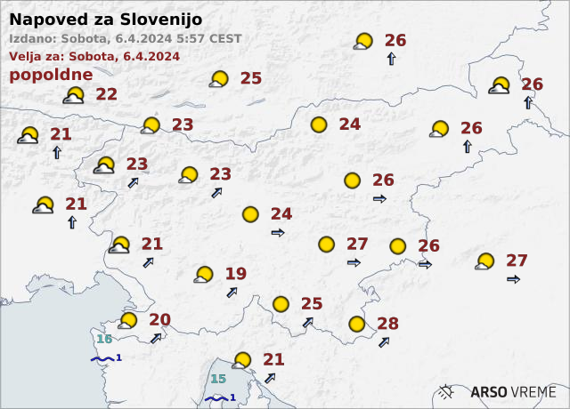Najvišje dnevne temperature bodo od 23 do 28 stopinj Celzija, na Primorskem okoli 20 stopinj Celzija.
