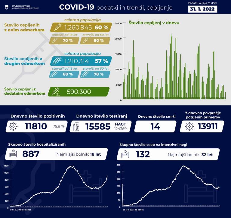 Trenutno je po podatkih Covid-19 Sledilnika v bolnišnicah hospitaliziranih 887 covidnih pacientov, od tega je 132 pacientov na intenzivni negi.