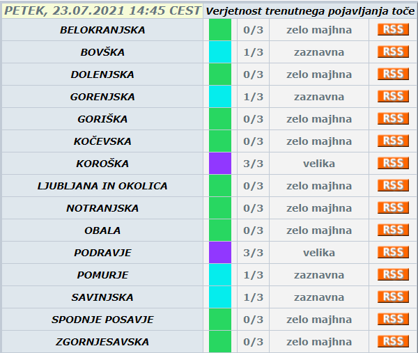 Po podatkih Agencije Republike Slovenije za okolje je v danes popoldne na Koroškem, Štajerskem in v Prekmurju možen razvoj močnejših krajevnih neviht.