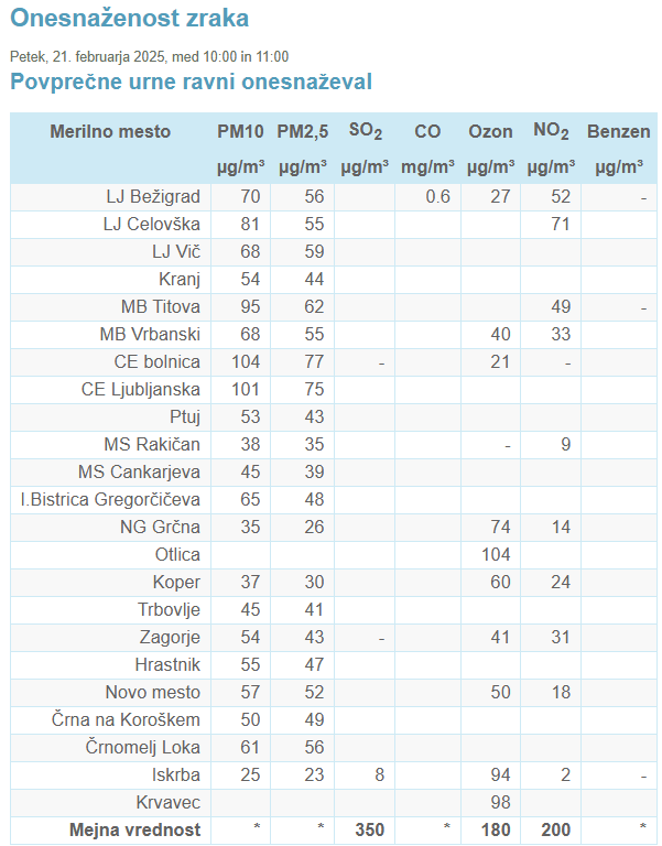 Po podatkih merilnih postaj so danes med 10. in 11. uro najvišje koncentracije delcev zaznali v Ljubljani (Bežigrad, Celovška, Vič), Mariboru, Celju in Trbovljah, kjer so vrednosti presegle priporočene meje.