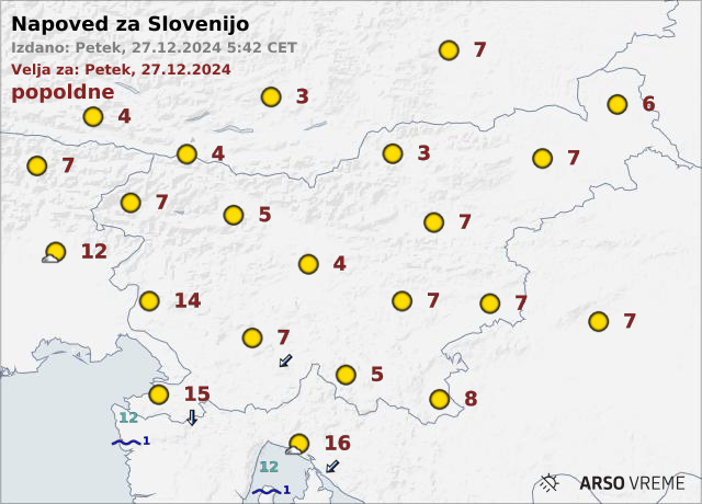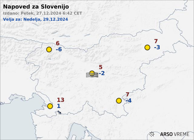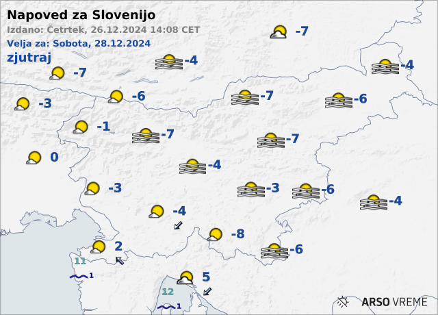 Jutranje temperature bodo padle med minus osem in minus eno stopinjo Celzija, ob morju pa se bodo gibale okoli dve stopinji Celzija. Najvišje dnevne temperature bodo podobne današnjim.