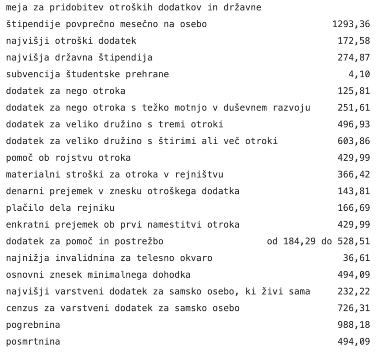 Usklajena meja za pridobitev otroških dodatkov in državne štipendije povprečno mesečno znaša 1293 evrov na osebo. To je 24 evrov več od dozdajšnjega zneska. Najvišji otroški dodatek po uskladitvi znaša dobre tri evre več, najvišji osnovni znesek državne štipendije pa malenkost nad pet evrov več.