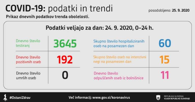 Potrdili so 192 novih okužb, kar je doslej absolutni rekord v dnevnem številu novih okužb. Spomnimo: pred tem so v Sloveniji največ primerov zabeležili v četrtek, 17. septembra, ko je bilo ob 3.557 testiranjih zabeleženih 137 okužb.