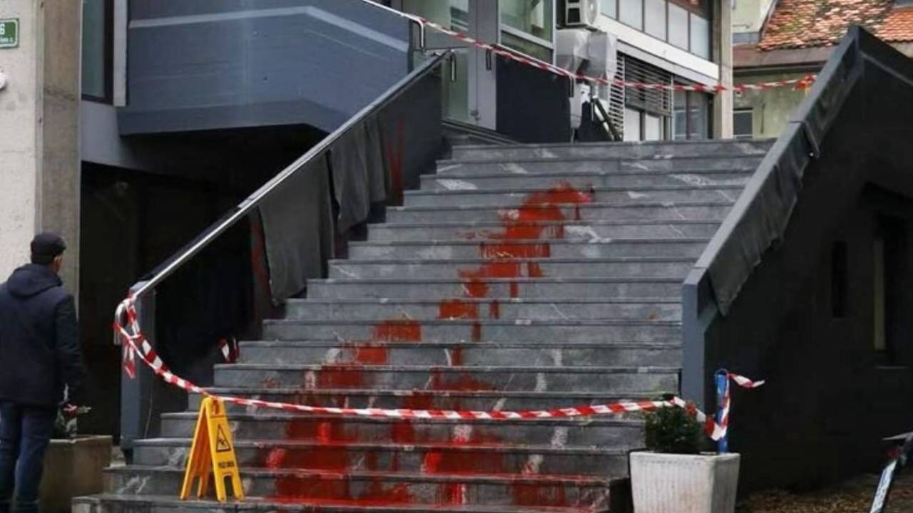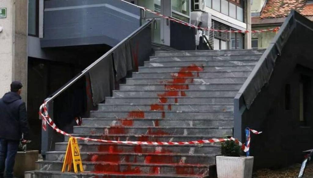 Na vhodu v ljubljansko Fakulteto za strojništvo so včeraj ponoči neznanci stopnice polili z rdečo barvo in ob tem na ograjo prav tako z rdečo napisali »partner genocidu«.
