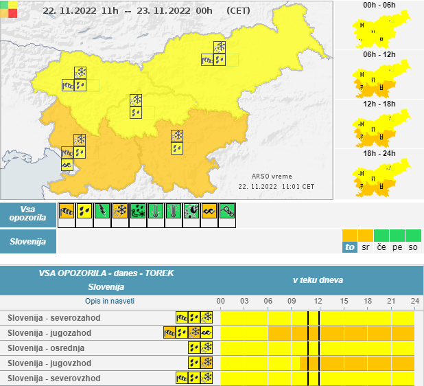 Agencija Republike Slovenija za okolje pa je za celotno južno polovico države za danes izdala oranžno vremensko opozorilo zaradi sneženja, burje in plimovanja morja, za severno polovico države pa je izdano rumeno vremensko opozorilo.