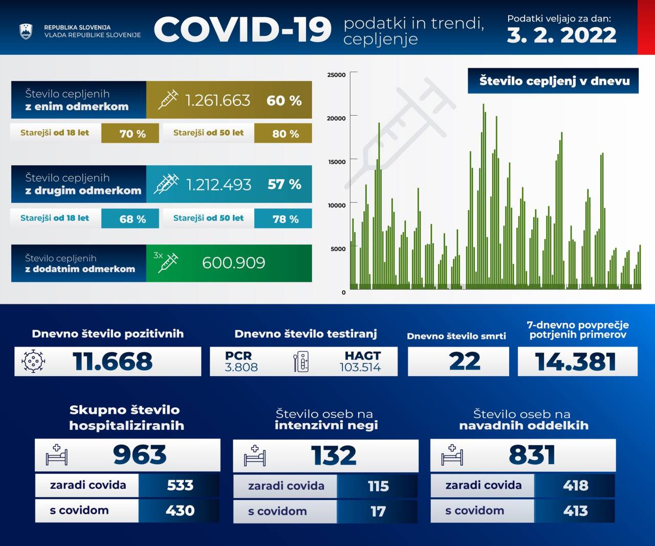V Sloveniji so včeraj, 3. februarja, opravili 3808 PCR in 103.514 hitrih antigenskih testiranj na koronavirus in pri tem potrdili 11.668 novih okužb.