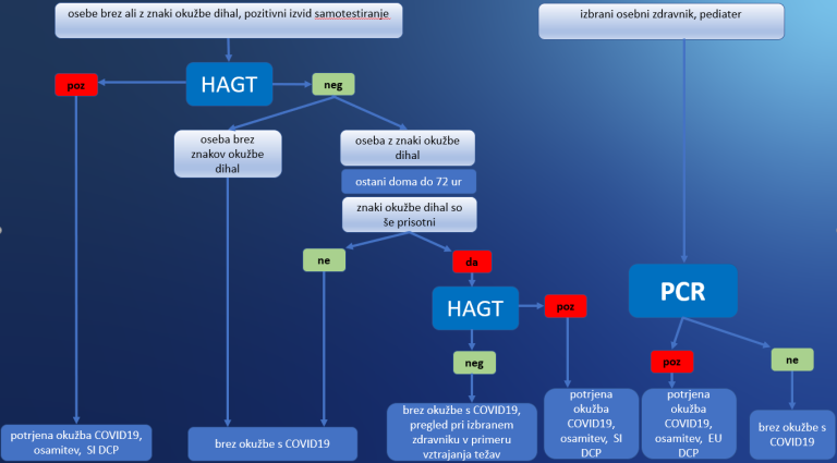Če so po tem času simptomi še vedno prisotni, je treba ponovno opraviti hitri test. Če je ta pozitiven, gre za potrjeno okužbo, v nasprotnem primeru pa naj se oseba obrne na izbranega osebnega zdravnika.