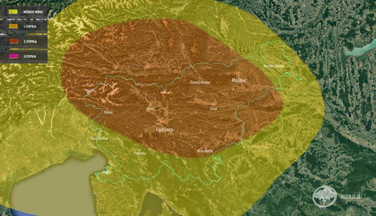 Območje zarisano z oranžno barvo predstavlja, kjer se lahko razvijejo močnejše nevihte.