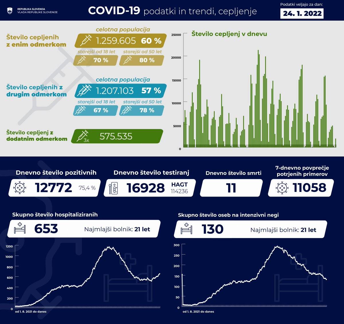 V Sloveniji so včeraj, 24. januarja, opravili 16.928 PCR testiranj na koronavirus in potrdili 12.772 novih okužb, gre za 75,4-odstotni delež okužb.