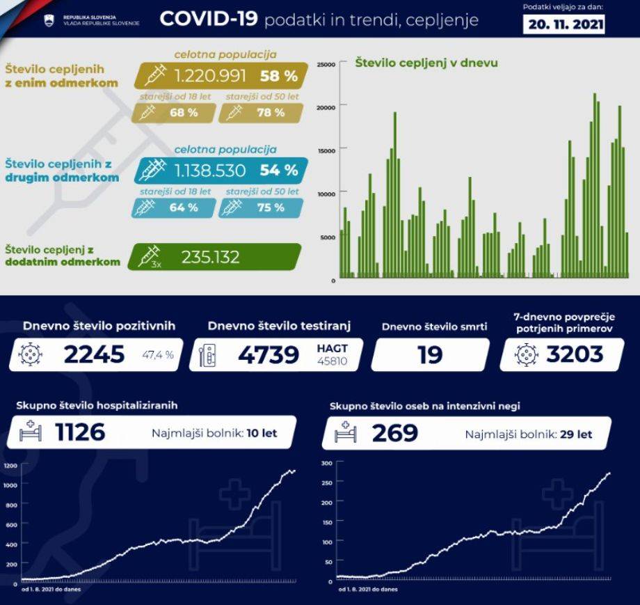V Sloveniji so včeraj, 20. novembra, opravili 4739 PCR testiranj na koronavirus in potrdili 2245 novih okužb, gre za 47,4-odstotni delež okužb.