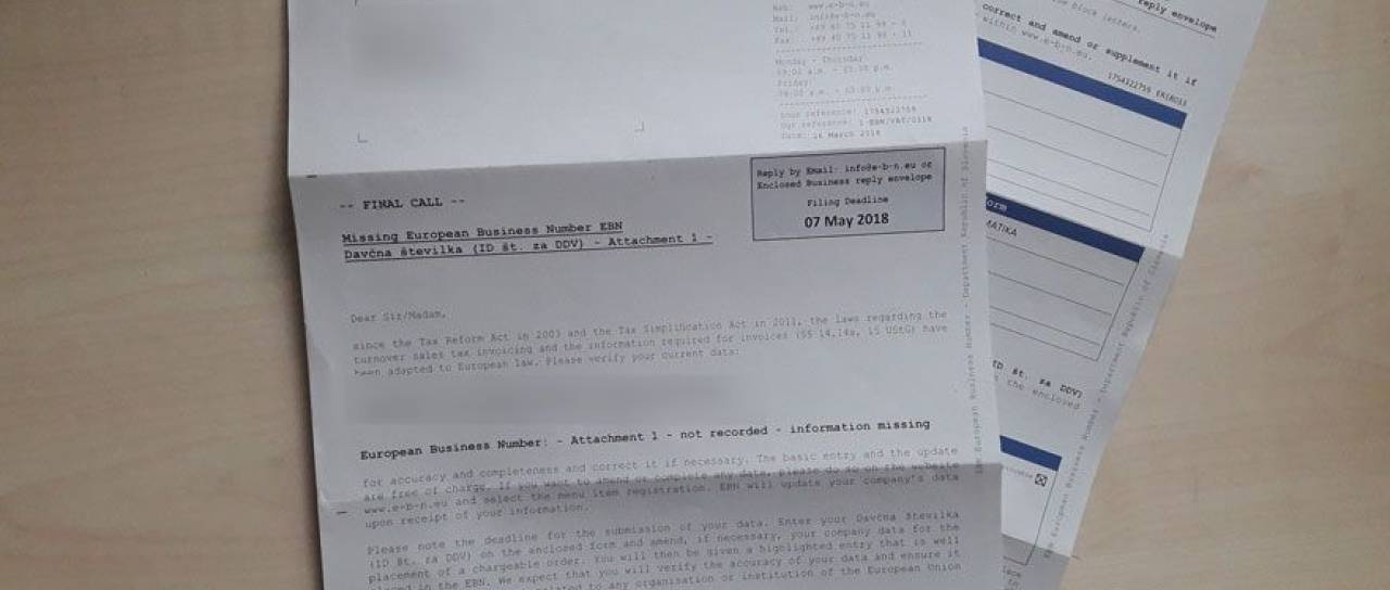 Prevaranti prejemnike pisem, pred katerimi smo svarili že pred časom, vabijo, da se prijavijo v brezplačno poslovno bazo in si tako zagotovijo evropsko poslovno številko, ki naj bi bila potrebna za podjetja v EU.