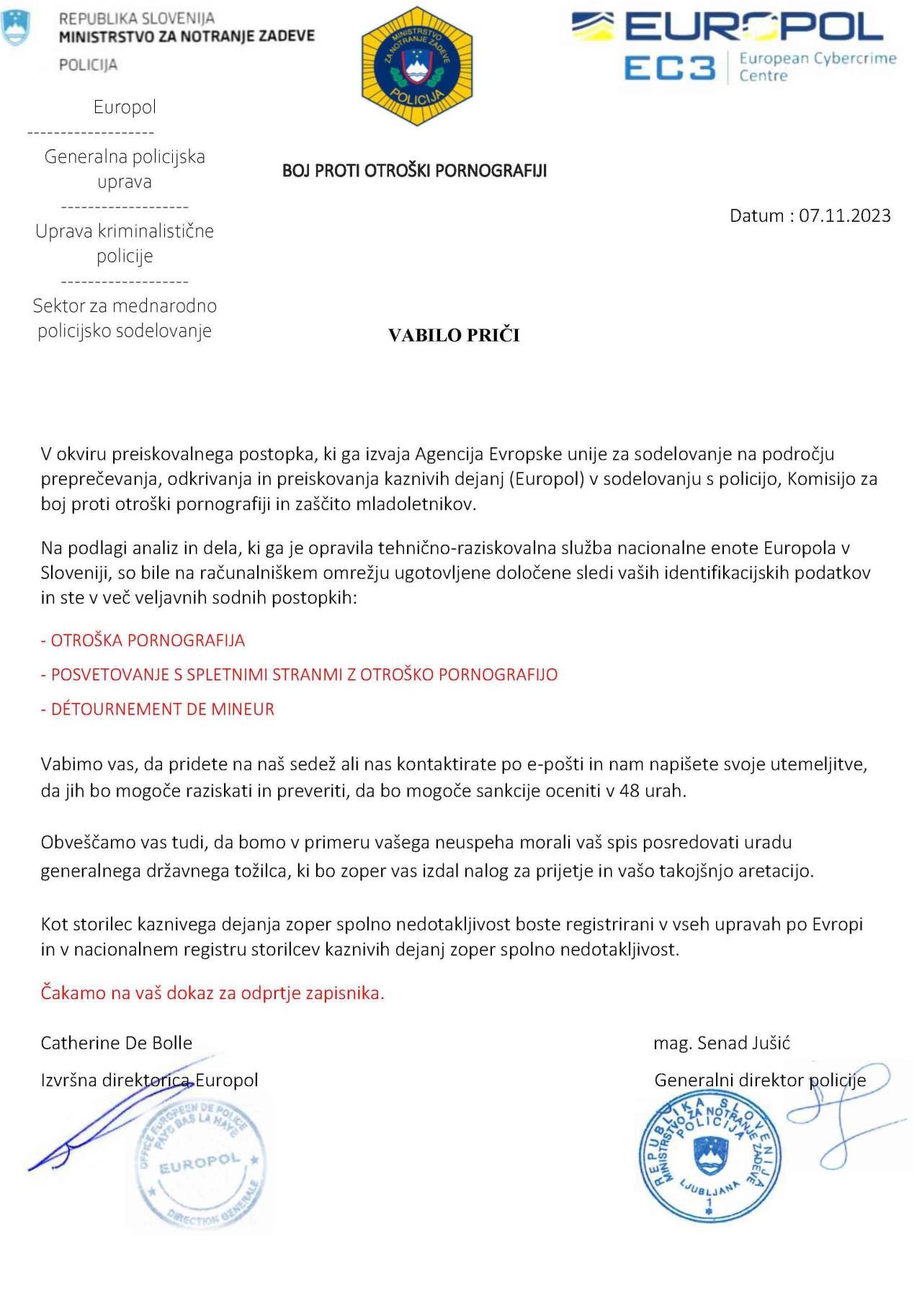 V dopisu sta omenjena Europol in slovenska policija, kot podpisnik pa je lažno naveden generalni direktor policije.