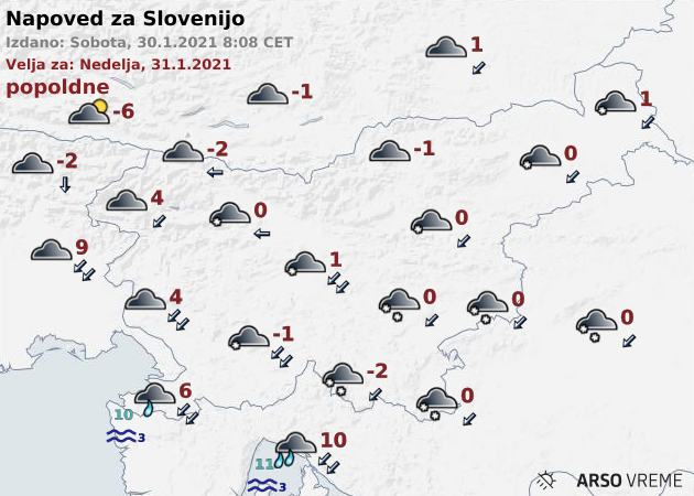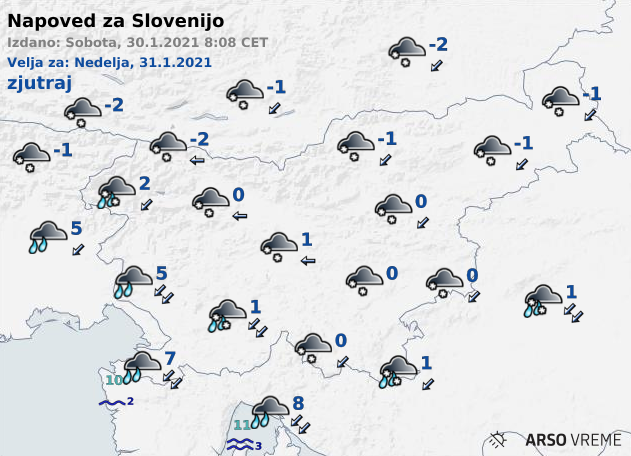 Pihal bo severovzhodni veter, na Primorskem zmerna burja. Temperature bodo okoli 0, na Goriškem in ob morju od 5 do 8 stopinj Celzija.