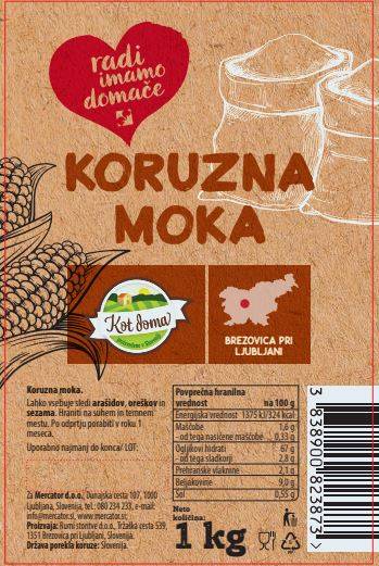 - OPIS IZDELKA (TIP/OZNAKA): Koruzna moka; blagovna znamka: radi imamo domače; vsi roki uporabe; črtna koda: 3838900823873; 1 kg,