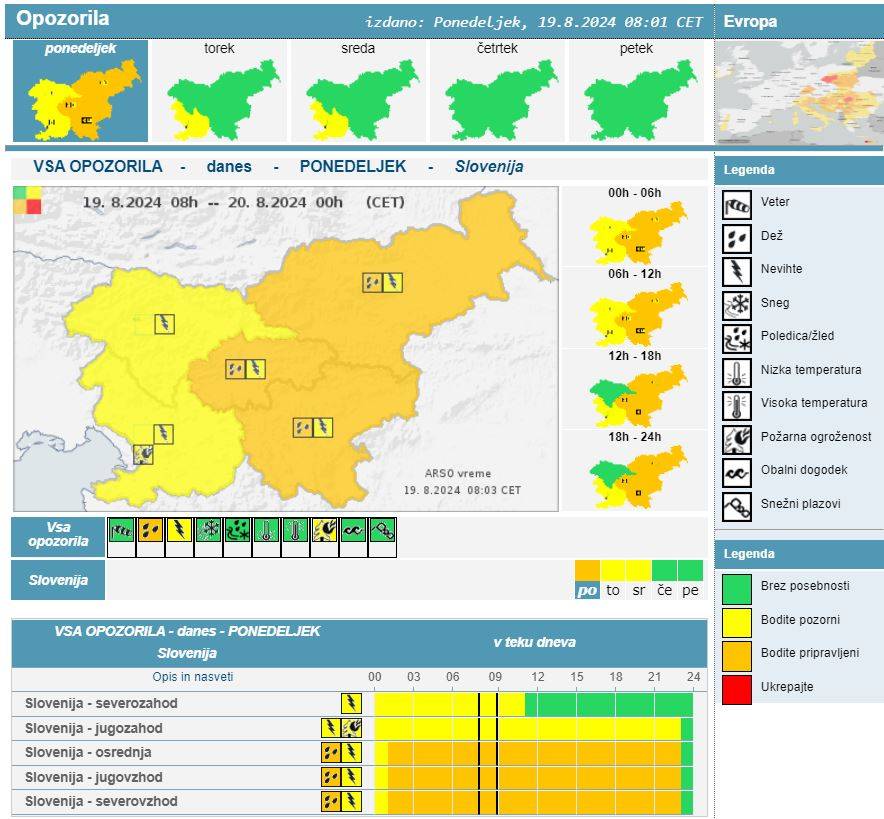 Krajevne padavine, tudi posamezne nevihte, se bodo nadaljevale zvečer in v prvem delu noči. Do jutra bodo povečini ponehale. Najnižje jutranje temperature bodo od 16 do 20 stopinj Celzija.