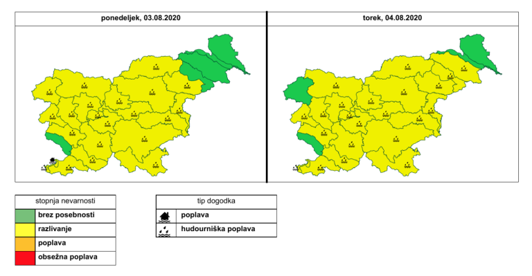 Po napovedih državnih hidrologov lahko ob močnejših nalivih predvsem v zahodni, jugozahodni, severni in osrednji Sloveniji hitro narastejo hudourniški vodotoki in manjše reke. Ob tem so ponekod možna tudi razlivanja. Ta pojav bo možen tudi v torek čez dan.